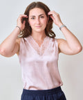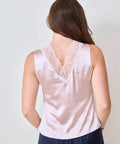 Romantic and delicate camisole from WE-R4 in a retro inspired silhouette. Satin and lace combine for this fall must-have that looks great peeking out from a blazer or cardigan. Soft hue pairs effortlessly with everything. 100% Polyester. Dry clean. Ella is 5'6" and wearing the small.