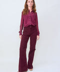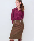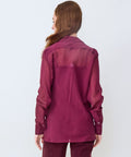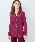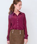 Slinky, silk blouse by Brazeau Tricot. Classic shirting design, including a standard collar and full button front. The sheer flowy fabric can be worn over a tank or cami...or just a bra. You get to decide. Pair with a smart pair of trousers, skirt or date night denim (with just a bra of course). 100% silk. Hand wash, lay flat to dry. 1=XS 2=Small 3=Medium 4=Large. Lindsay is 5'6" and wearing the size 0.