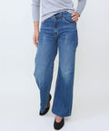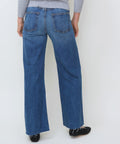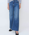A vintage-inspired wide-leg jean with attitude from ASKK. Flattering high rise, a relaxed fit through the hip, and a full leg with just the right amount of structure. Finished with a raw hem and a perfectly faded wash for that lived-in look. 12" rise, 28" inseam, 23" leg opening. 100% cotton, 11oz Japanese denim. Machine wash cold, do not tumble dry. Made in Los Angeles. Designed for a relaxed look. Be cool and take your true size or size down for a more fitted look. Jenna is 5'8" and wearing the 26.