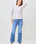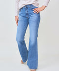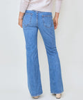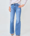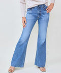 The perfect flare from ASKK in a medium wash. Full length, high rise jean is fitted through the hip and thighs then flares to a wide leg. Rigid denim that's anything but stiff. Wear with a nice pointed boot. 11" rise, 32" inseam, 23" leg opening. 100% cotton. Machine wash in cold, do not tumble dry. Made in Los Angeles. Jenna is 5'8" and wearing the size 26.
