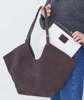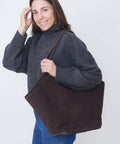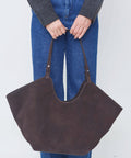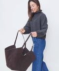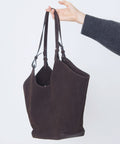 A large suede tote from Flattered is as beautiful as it is functional. Shoulder straps feature a pin and loop closing with exposed gold tone hardware. Roomy interior with toggle closure and attached pouch with zippered top. Smooth leather bottom in monochromatic shade adds to the durability. 100% calf leather with cotton lining. Dimensions: H 10.62 x W 10.62 inch x D 5.11 inch. 14" handle drop. Crafted in Italy.