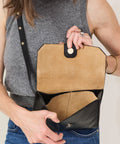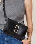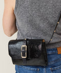 We are loving this powerhouse of a bag from Herbert Frere Soeur. La Lulu is compact bag, clutch style made in a mix of their signature "crispy" patent and a divinely soft leather. An elongated buckle wraps around the bag like a bet and fastens with a flap & magnetic closure. Inside there are 4 compartments inside to keep you organized. The strap is adjustable and fully removable so you can wear it as a crossbody or a clutch and there are gold studs along the strap. The strap is adjustable and fully removable so you can wear it as a crossbody or a clutch and there are gold studs along the strap. Measures 8.5" x 6.5" with a 2" gusset. The soft nature of the leather means you can stuff it more full than that 2". Crossbody strap adjustable from 29" to 39".