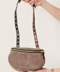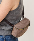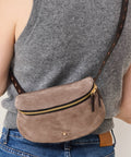 A favorite belt-bag style from our family owned and run French leather brand, Herbert Frere Soeur.  La Lili New is a bit more spacious than their original Lili. This one is made in a soft suede with a leather backing & bag strap.  Zip closure.  Measures approximately 10.2" x 7" x 3.3".  Strap length is adjustable up to 45" long.