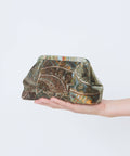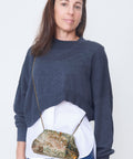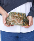 Liette is a classic, feminine handbag from Marian Paquette, a brand that marries handmade craftsmanship with timeless design. Italian paisley printed velvet exudes sophistication. Velvet wrapped frame with contrast lining. Vintage mesh pulls open the bag, which has a magnetic closure. 46" metal chain can be tucked inside so you can wear it as a clutch or crossbody. Measures 8.25" x 5.5" x 2". Made in the USA.