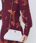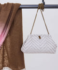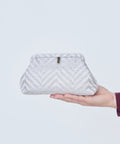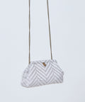 Liette is a classic, feminine handbag from Marian Paquette, a brand that marries handmade craftsmanship with timeless design. Woven French fabric in a monochromatic chevron pattern exudes sophistication. Fabric wrapped frame with contrast lining. Vintage mesh pulls open the bag, which has a magnetic closure. 46" metal chain can be tucked inside so you can wear it as a clutch or crossbody. Measures 8.25" x 5.5" x 2". Made in the USA.