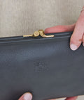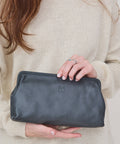 A classic clutch from Il Bisonte - best to get it from this heritage brand because this one will last forever.  A framed clutch with a retro clasp closure. Lined with small interior pocket.  Measures approximately 10" x 5".