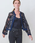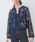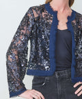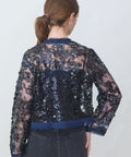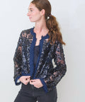 Short sequin jacket from our friends at Baum, who continue to create unique pieces. This one combines dazzling glamour with modern details. Designed with a sheer base for an ethereal touch, this jacket is finished with a frayed hem, adding a hint of edginess to its already chic silhouette. Perfect for layering with a single hook close at neck. A bold yet versatile piece for special occasions or elevating casual looks. 100% Recycled Polyester. Dry clean. 34=XS 36=Small 38=Medium 40=Large. Lindsay is 5'6" and wearing the 34.