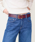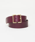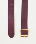 Subtle yet distinctive black belt from family owned French brand Herbert Frere Soeur. Two sleeve rectangles join to create a sculptural square buckle. 1.5" width and gold hardware. Sizes roughly translate as follows: 75=xsmall, 80=small, 85=medium, 90=large.