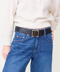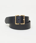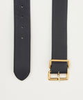 Subtle yet distinctive black belt from family owned French brand Herbert Frere Soeur. Two sleeve rectangles join to create a sculptural square buckle. 1.5" width and gold hardware. Sizes roughly translate as follows: 75=xsmall, 80=small, 85=medium, 90=large.