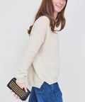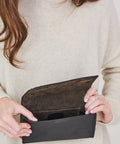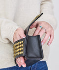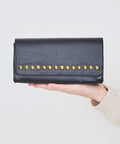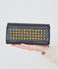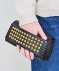 A chic and boxy little clutch combines form and functional beautifully. Buttery black leather is accentuated with smooth brass studs - a single row lining the magnetic flap closure while a bolder formation of studs decorates the hand-strap on the clutches backside. Suede-lined interior with interior credit card pocket. Measures 7.5" x 4" x 2.5".