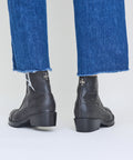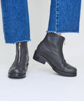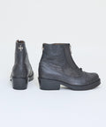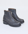 A dark grey lug sole boot from Calleen Cordero.  Round toe, front zip with a very subtle hand-studded detail on the back of the boot.  The leather is soft with a pebbled texture, but it is durable and will mold to your foot, creating a loving/lasting relationship between you and your boots.  Subtle, rubber log sole on a stacked 1.75" heel.  Leather construction, padded footbed, textured rubber sole.