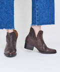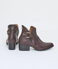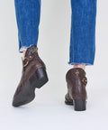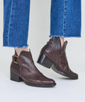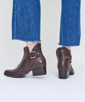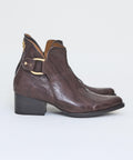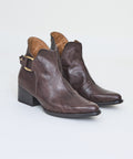 A subtly textured brown leather boot from Calleen Cordero.  The Prado boot is made on a familiar last that we value for comfort.  It has a softly pointed toe and a stacked 2" heel, giving you just enough lift and creating a sleek silhouette that complements a long pair of jeans or trousers or a skirt or dress.  It has tab/buckle at the ankle that allows you to open it up for easy on-and-off and a subtle hand studded detail on the back of the heel.  Padded leather insole for all the comfort.