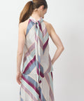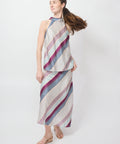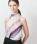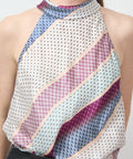 This Christy Lynn blouse brings effortless drama with a playful twist. Designed with a chic halter neckline and an easy, swingy fit, it features a lively mix of diagonal stripes and micro-dot patterns in soft, unexpected color combos. Lightweight and flowy, it moves beautifully from day plans to dinner dates—no costume change required. Style it tucked or untucked, dressed up or down, and let the print do the talking. Halter neckline with a tie at the back of the neck. 64% viscose, 36% silk. Lining is 95% polyester, 5% elastane. Dry clean only. Lindsay is 5'6' and wearing the XS.