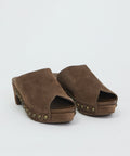 Chocolate brown suede clog with peep toe and metallic stud detailing. Anatomical footbed with matching suede wrapped platform. A Pedro Garcia classic in unlined cowhide. Sleek and easy. 65mm heel height. Made in Spain. European sizing as follows: 36=US6, 37=US7, 38=US8, etc.