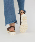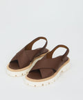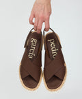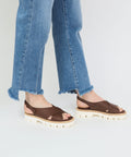 Cross strap comfort sandal with lightweight lugg sole from Pedro Garcia. Unlined pebble grain cowhide upper with velcro heel strap. Made for stability and heavy usage. Dark upper nicely contrast against a lighter sole. 40mm heel height. Made in Spain. European sizing as follows: 36=US6, 37=US7, 38=US8, etc.
