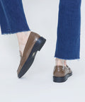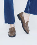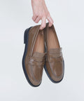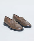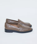 Olive green loafer with a sheen from Flattered. Classic penny loafer style is updated with a slender almond toe and patent finish. Cow leather upper, footbed and lining. Resin rubber (Thunit) outsole. 20mm heel height. Made in Spain. 36=US6, 37=US7, 38=US8 and so on.
