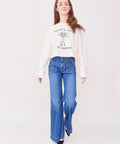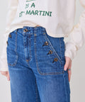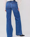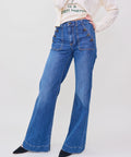 ASKK designed denim with a mid rise and dramatic wide leg. Bold yet timeless silhouette, with button detail front pockets and an elongated inseam, gives this style a polished finish. Stretch, 10oz Japanese denim ensures a flattering fit with everyday wearability. A modern statement jean that balances vintage inspiration with ease. 98% cotton/ 2% pu. Machine wash cold, do not tumble dry. Made in Los Angeles. Rise: 10.5", Inseam: 33", Leg Opening: 24". Lindsay is 5'6" and wearing a 25.