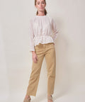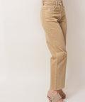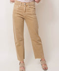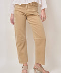 Soft & slim barrel silhouette with a mid-rise and seam detailing from Le Jean. These jeans have darting at the pockets and knees. Cut from mid-weight, ultra-soft denim in a sandwashed camel, they have a cool girl frayed hem. Rise: 11", Inseam: 27", Leg opening 16". 98% cotton, 2% elastane. Machine wash cold. Made in LA. Lindsay is 5'6" and wearing the 25.
