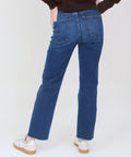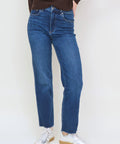 A high rise version of Le Jean's Sabine style. This is a straightforward, straight jean in a super soft, stretchy denim that the brand is known for. Mid-blue color that is an appropriate choice year round. 11" rise, 28" inseam with raw hem. 93% cotton, 5% polyester, 2% spandex. Machine wash cold inside out. Tumble dry low, removing promptly from the dryer. This style runs smaller than some styles by Le Jean. If in doubt size up. Lindsay is 5'6" and wearing the 25.