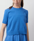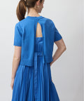 The Electric Poise Dress pairs a sleek knit top with a flowing pleated skirt for a two-piece look that feels polished, modern, and quietly bold. Saturated blue sets the tone—vivid yet refined—while the cropped sweater adds structure and contrast to the fluid movement below.