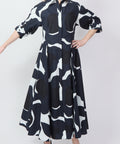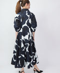 The Graphic Bloom Dress takes classic florals and flips the script with a bold, high-contrast print in black, navy, and white. Cut with a structured shirt-dress bodice and a flowing, full skirt, it balances polish with movement in all the right ways. The defined waist creates a confident silhouette, while the printed fabric brings drama with every step (and spin). Elbow-length sleeves and a covered button front keep it grounded and wearable, while the striking pattern does all the talking. Full skirt with pockets falls from a seamed waistline. Unlined. 100% cotton. Machine wash or dry clean, do not tumble dry. Lindsay is 5'6" and wearing the 38.