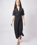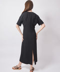 Short sleeves, v-neck, side zip for easy entry. Machine wash cold/gentle and lay flat to dry. 95% polyester, 5% elastane. 38=XS 40=Small 42=Medium 44=Large. Lindsay is 5'6" and wearing the 38. M6PF12 Black split collar dress with gathered front detail, 95% polyester, 5% elastane