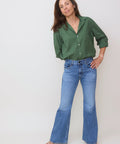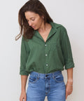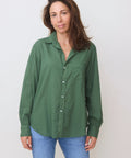 Every gal needs a friend like Eileen: she's relaxed and always makes you feel comfortable. She can be tucked, tied or tossed on. Made in a super soft featherweight cotton. This style is Frank & Eileen's most generous cut. A slight a-line shape with a generous fit. 100% cotton. Machine wash cold, tumble dry low. Jenna is 5'8" and wearing the small.