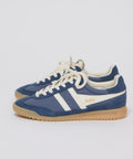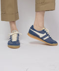 Classic, cool, and ready to move—this Gola sneaker pairs rich blue suede with crisp white stripes and a gum sole for instant vintage cred. Easygoing comfort, confident style, zero overthinking required.
