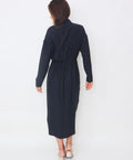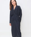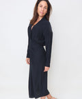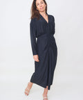 A knockout dress from Go Silk, designed to do it all.  Long sleeve, v-neck, it has elasticized ruching below the bust and down the front of the waist to flatter and disguise.  Straight through the skirt and falls below the knee.  Jenna is 5'8" and wearing the XS.