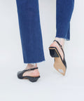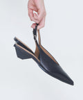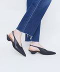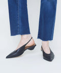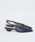 Pointy toe slingback on a triangular kitten heel from Flattered. Classic shape is updated with a slightly edgy stacked wood heel shape, offering a style that everyone needs in their closet. Chic and practical, this shoe litterally goes with everything from dress, to denim to elegant trousers. Goat leather upper, lining and footbed with resin rubber sole (Thunit). 40mm heel height. Made in Spain. 36=US6, 37=US7, 38=US8 and so on.