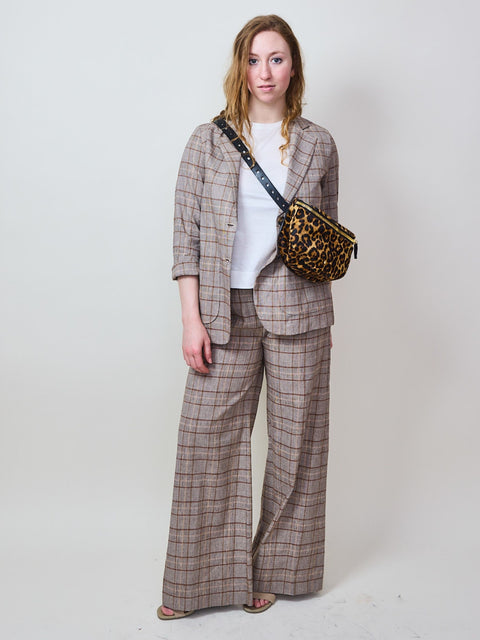 This one is made in a soft, printed haircalf leather with camel colored leather back and belt strap.  Zip closure.  Measures approximately 10.2" x 7" x 3.3".  Strap length is adjustable.