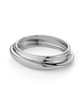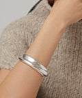 An organic, deeply contoured bangle from Jenny Bird. It opens with a hinge and tab-lock closure. Interior circumference measures 7.13". Interior diameter measures 1.99" one direction, 2.48" the other. Made of a high polish silver.