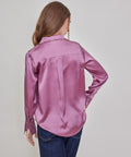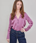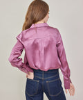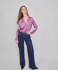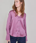 Classic silk blouse from our friends at Go Silk. Button front with v-neckline and collar. Longer cuffs can be turned back if desired. A closet staple to wear alone or as a layering piece. 100% Silk. The best thing about Go Silk is that it's made of washable silk. These pieces can be washed in the machine on the "hand wash" setting and hung to dry. Lindsay is 5'6" and wearing the XS.