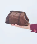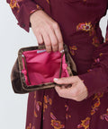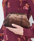 Liette is a classic, feminine handbag from Marian Paquette, a brand that marries handmade craftsmanship with timeless design. French ombre velvet insures each bag is unique and creates a stunning textile play. Velvet wrapped frame with contrast lining. Vintage mesh pulls open the bag, which has a magnetic closure. 46" metal chain can be tucked inside so you can wear it as a clutch or crossbody. Measures 8.25" x 5.5" x 2". Made in the USA.