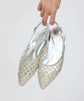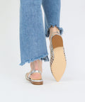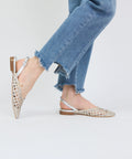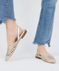 A metallic pointed toe slingback flat from Marion Parke crafted in a braided Nappa leather with gold adjustable hardware. Stacked 10mm heel with leather footbed. Made in Brazil. Runs true to size.