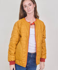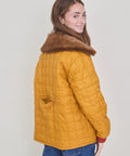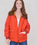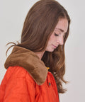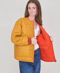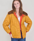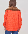 A mid-weight reversible jacket with detachable faux shearling collar. It's quilted with a zip front. The bright orange side has patch pockets with snap closure while the amber side has an open patch pocket. Nylon shell with a down & feather fill. Machine wash cold, lay flat to dry. 100% nylon shell with 80% down/20% feather fill. Runs true to size. Lindsay is 5'6" and wearing the XS.