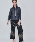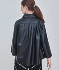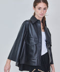 Grenn Pilot's leather swing jacket, made of a soft and supple leather so it can be worn easily as a jacket or a shirt. ¾ sleeves, with a sloped hem that is slightly longer in the back than in front. Flap pockets are faux, with the pocket entry on the sides for a more ergonomic construction. Snap closure. Made in Turkey. Grenn Pilot is a woman-owned and woman-run brand. It is part of the Leather Working Group, an organization that responsibly sources leather and takes great strides to reduce waste throughout the leather supply chain. 100% leather. Lindsay is 5'6" and wearing the XS.