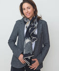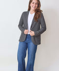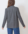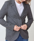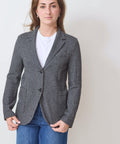 Harris Wharf's Boyfriend Blazer is a favorite at Tea & Oranges. Constructed of a grey/black houndstooth knit, the fabric is incredibly soft and stands up to tons of wear. It has a tailored appearance for a finished look, but is unlined and feels like wearing a cardigan. Stand up collar, straight fit and front patch pockets make this appropriate for outerwear or worn as a traditional blazer over a shirt or top. This is the type of piece we believe fits in every woman's closet. 47% wool, 42% cotton, 10% polyamide, 1% elastane. Dry Clean.