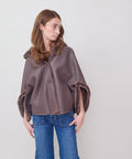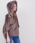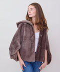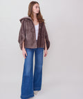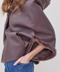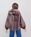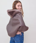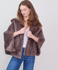 Reversible shearling hooded cocoon jacket from Grenn Pilot. Super cool swing-style coat with bracelet length sleeves evokes old Hollywood glamour. Slips on effortlessly over casual and dressy situations to create an iconic, yet comfortable look. Timeless luxury at its best. Snap front with hand warmer pockets. Merino Tempesta Nubuck Shearling. Professionally clean. An easy fit. Lindsay is 5'6" and wearing the small.