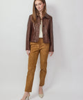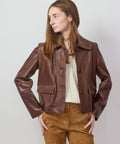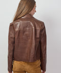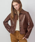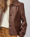 Arma brings their butter soft leather to this cropped blazer. Throw this on as a chic outer layer or as a blazer over a tank or cami. Rounded tip collar with 3 button closure and front flap pockets. Dropped shoulder construction with wider, slightly belled sleeves. Unlined. Professionally leather clean. 100% lamb leather. Lindsay is 5'6" and wearing the 34.
