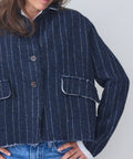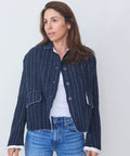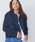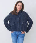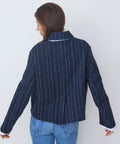 Beautiful Harris Tweed navy pinstripe jacket from Hannoh Wessel.  Spread collar, 3 button closure, welt pockets, boxy fit.  Made in Italy from authentic Harris tweed.