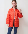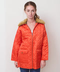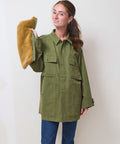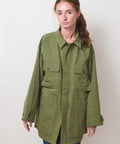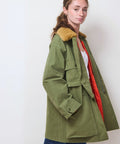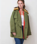 Military inspired outerwear from The Great. Designed with versatility in mind—it can be worn five different ways. The structured slub cotton shell has a lived-in feel and is detailed with oversized utility pockets and a wide placket with a zip closure. A removable faux fur collar buttons onto both the shell and the quilted nylon liner, in a shocking peppery red btw, which can be worn zipped inside or on its own. The fit is oversized and hits just below the hips. 100% cotton (shell) - 55% Polyester, 45% Rayon (liner). Dry clean. Sizing: 0=XS, 1=S, 2=M, 3=L. Lindsay is 5'6" and wearing the size 0.