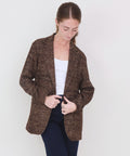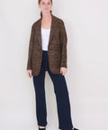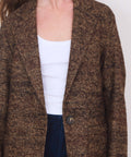 Warm and cozy blazer from Diega in a herringbone tweed. Classic styling details such as notched collar, front patch pockets and single button close. Slightly longer length covers your bum. Substantial enough to be used as outerwear on milder days. Lined. 49% Polyester, 22% Wool, 22% Acrylic, 7% Other fibers. Lining: 100% Viscose. Dry clean. Made in Morocco. Designed for an oversized fit, size down for a more traditional fit. Lindsay is 5'6" and wearing the XS.