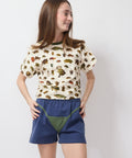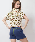 We're not waiting for summer to wear our bikinis.  Really cozy sweat shorts made of a lovely cotton, with a little extra for something to make you smirk.  The applique string bikini detail is a delightful contrast to the cozy silhouette.  100% cotton.  Lindsay is 5'6" and wearing the XS.