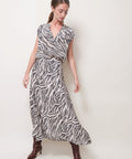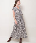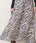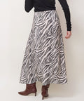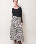 Beautiful midi length skirt from Maria Cher that's flowy and flirty. A-line skirt sports an abstract black and white print that creates a base for all sorts of colors. Pair with a brightly colored sweater or the Keyla top in the same pattern for a coordinated look. Elasticized waist with side zip. Lined. 100% Viscose Natural Crepe. Hand wash, lay flat to dry. Lindsay is 5'6" and wearing the XS.