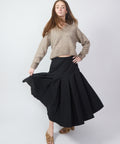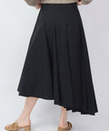 Cut from crisp cotton with an asymmetrical hem that moves with intention. Structured at the waist and fluid through the skirt, it creates a bold silhouette that feels both grounded and dynamic. The angled panels add depth and motion, giving classic black a sharper, more architectural edge. Crafted from cotton poplin, this skirt features horizontal seaming at the waist that gently falls into soft, wide pleats. Dress up or down, t-shirt or silk blouse, this piece is very versatile. Side zip, unlined. 97% cotton, 3% elastane, Wash cold or dry clean, do not tumble dry. 38=XS 40=small 42=medium 44=large. Lindsay is 5'6" and wearing the 38.