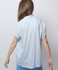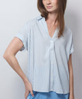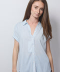 Cool, and confidently effortless. Cut with a relaxed fit, short sleeves, and a classic button-down front, it brings polished energy without trying too hard. The light stripe keeps it fresh, the silhouette keeps it modern. 96% viscose Lenzing Ecovero, 4% elastane. Hand wash, hang dry and low iron, or dry clean. Lindsay is 5'6" and wearing the XS.