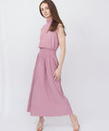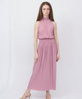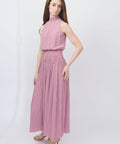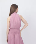 A pleated maxi from Samsoe that is soft, strong, and seriously chic. High neckline, fluid pleats, and a cinched waist that defines without squeezing too much, it moves beautifully and holds its own. Elegant, effortless, and quietly commanding. 93% recycled polyester, 7% elastane. Dry clean only. Sizes: XXS=32, XS=34, S=36, M=38, L=40, XL=42. Lindsay is 5'6" and wears an XS.