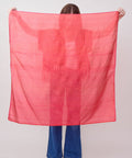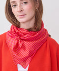 Last Chance Textile's cowboy scarves are a nod to a cowboy's wild rag - a true part of a cowboy's wardrobe that adds function first, beauty as an afterthought.  Last Chance's cowboy scarves are handwoven by the India-based Karghewale collection, whose mission is to empower artisans to build robust businesses.  This Cowboy Scarf is made of a lightweight silk where bold red is punctuated with pink and orange in a joyful plaid print.  100% handwoven silk with stitched edges, approximately 38" square.