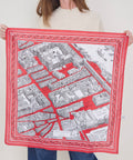 Inoui Editions put on a twist on the classic bandana (as they do), taking a cotton square bandana, a classic 65cm square with traditional paisley styling along its border. The interior illustration reflects an aerial map of the neighborhood of the Louvre. The illustration is hand drawn and depicts Paris of the past, but manages to feel current. 100% cotton. 65cm square. Machine wash gentle/cold and lay flat to dry.